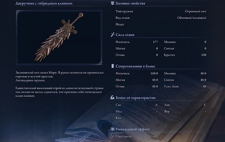 Двуручник с гибридным клинком (огромный легендарный меч): оружие с бонусом от Силы, а его уникальный эффект – рост всех характеристик после убийства врага. Идеальный выбор для бойца ближнего боя, который предпочитает стоять в первых рядах.
