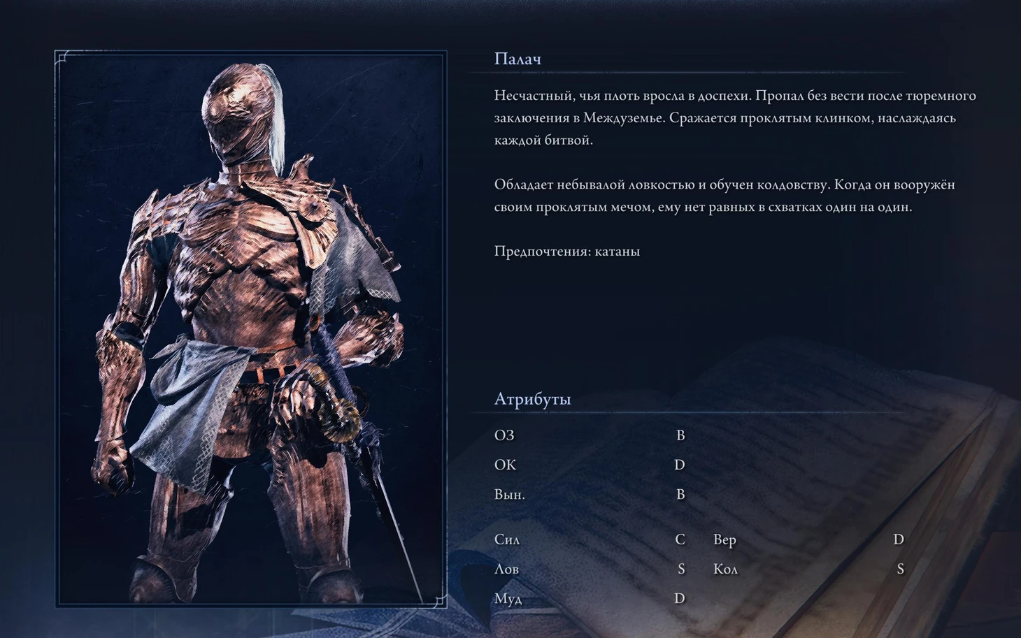 Палач – стремительный и агрессивный боец, напоминающий самурая, с боевым стилем, основанным на сериях комбо-атак и наложении негативных эффектов на врагов, таких как кровотечение или гниль. Лучшее оружие для него – две катаны, которые позволяет раскрыть его потенциал в ближнем бою и наносить непрерывный урон.