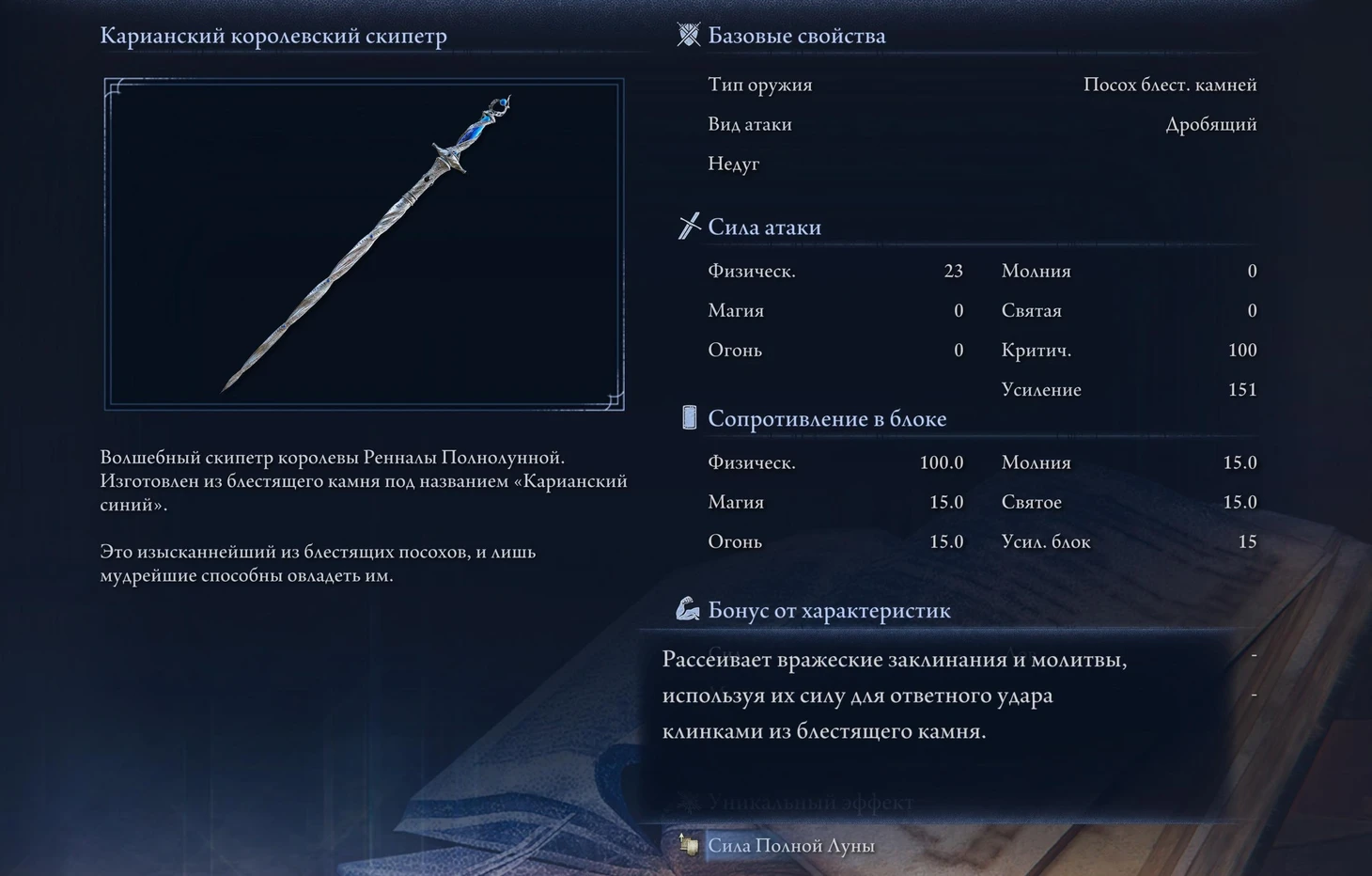 Карианский королевский посох: посох с максимальным бонусом от Мудрости, идеально подходящий для магического билда Герцогини. Однако его главное преимущество – уникальный эффект: вражеские заклинания и молитвы трансформируются в магические клинки, которые автоматически контратакуют противника.