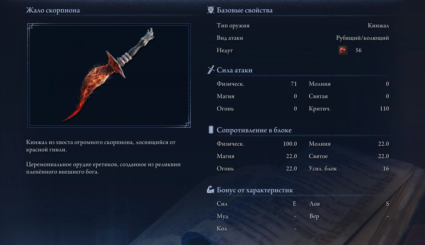Жало Скорпиона (эпический кинжал): кинжал с максимальным бонусом от ловкости, а так же эффектом гнили.