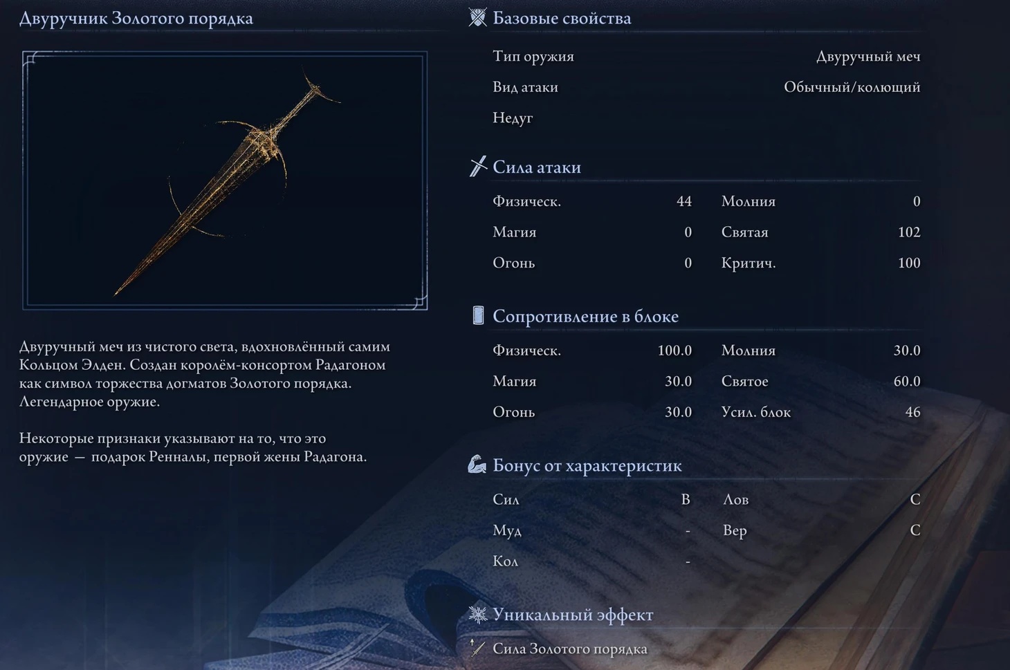 Двуручник Золотого порядка (легендарный двуручный меч): меч отлично скалируется с ключевыми характеристиками Уайлдера. Однако его главная ценность в уникальном эффекте: заряженные атаки очищают персонажа от всех негативных эффектов и исцеляют от недугов. Это делает оружие особенно полезным в сражениях с боссами.
