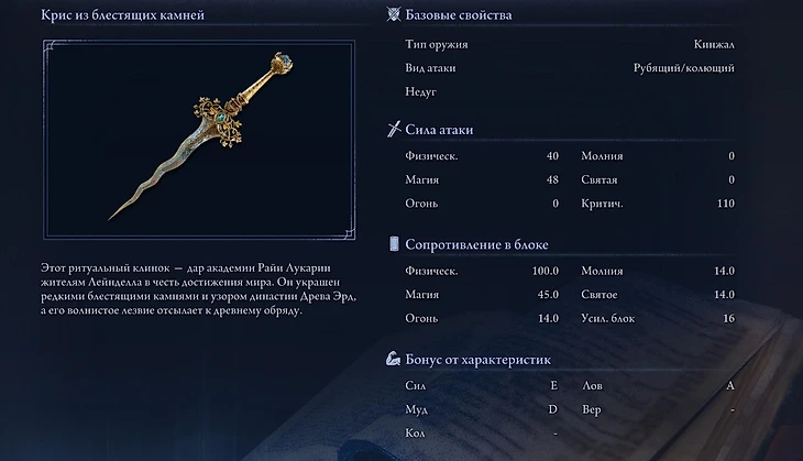 Крис из блестящий камней: Быстрый и смертоносный кинжал с магическим уроном. Оружие получает бонусы от ключевых характеристик Герцогини – Ловкости и Мудрости,