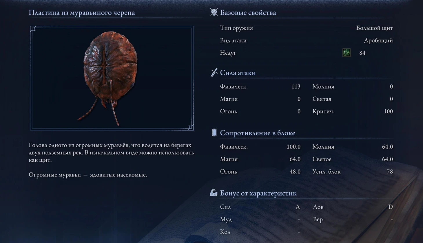 Пластина из муравьиного черепа (эпический большой щит): огромный щит, идеально подходящий для оборонительного стиля боя. Он не только обладает высокой прочностью и получает бонус от характеристики Сила, но и наносит ядовитый урон. Надежная защита и дополнительный урон в одном предмете.