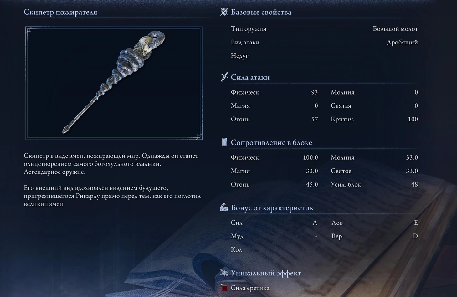 Скипетр пожирателя (легендарный большой молот): оружие с отличным бонусом от Силы и огненным уроном, а его уникальный эффект – восстановление здоровья после каждого убийства. Универсальный вариант, подходящий как для танков, так и для дамагеров.