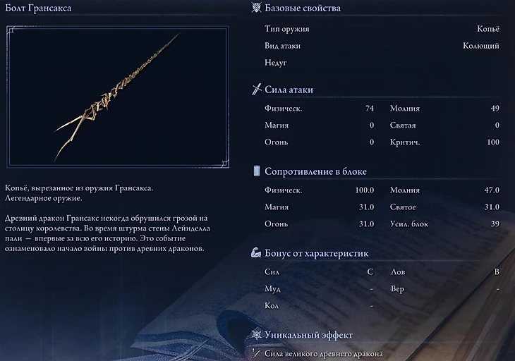Болт Грансакса (легендарное копье): отличное оружие, которое хорошо скалируется с характеристиками Стража и позволяет держать врагов на расстоянии, атакуя из-за щита. Уникальный эффект: заряженные атаки наносят дополнительный урон молниями.