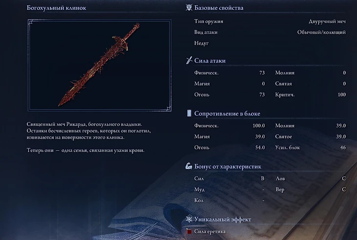 Богохульный клинок (легендарный двуручный меч): этот меч получает бонус к урону от ключевых характеристик Уайлдера – Силы и Ловкости (это называется скалирование). Его уникальный эффект – восстановление здоровья за каждое убийство, делает его отличным выбором для персонажа ближнего боя.