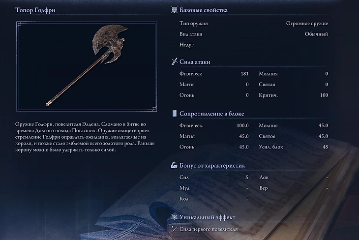 Топор Годфри (легендарное огромное оружие): максимальный от силы, а уникальный эффект усиливает заряженные атаки. Топор Годфри – это настоящее орудие разрушения, идеально подходящее для тех, кто делает ставку на тяжёлые атаки и максимальный урон в ближнем бою.