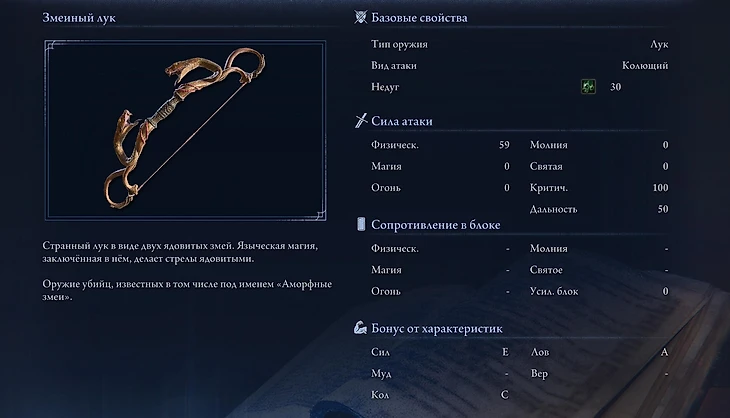 Змеиный Лук (эпический лук): Универсальное оружие, которое получает бонусы от Ловкости. Наносит постоянный ядовитый урон, что делает его отличным выбором для сражений с жирными боссами.
