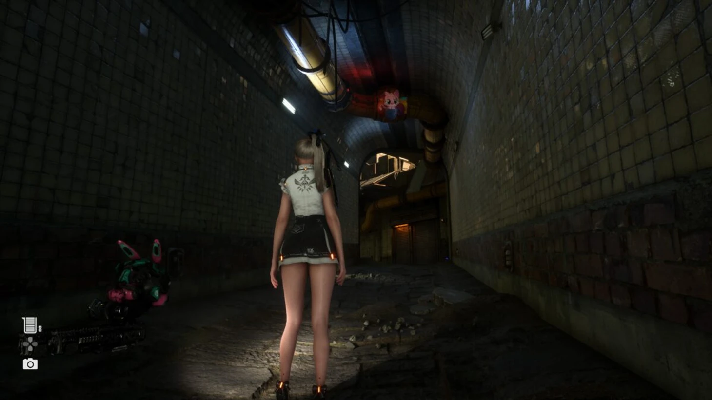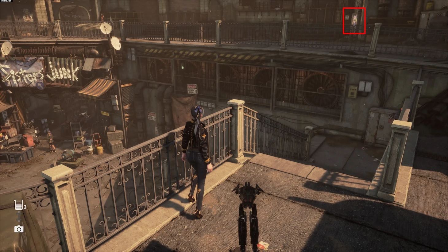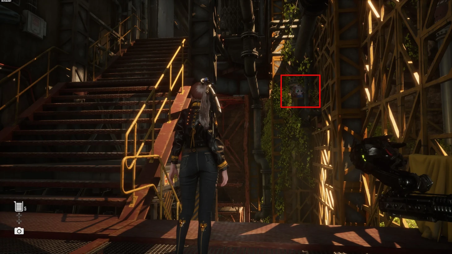 Спуститесь по длинной лестнице, ведущей к монорельсе. Не доходя до конца, остановитесь после первого пролета и осмотрите верхнюю часть стены перед вами. Среди труб вы заметите яркую кошку, выглядывающего из укрытия.