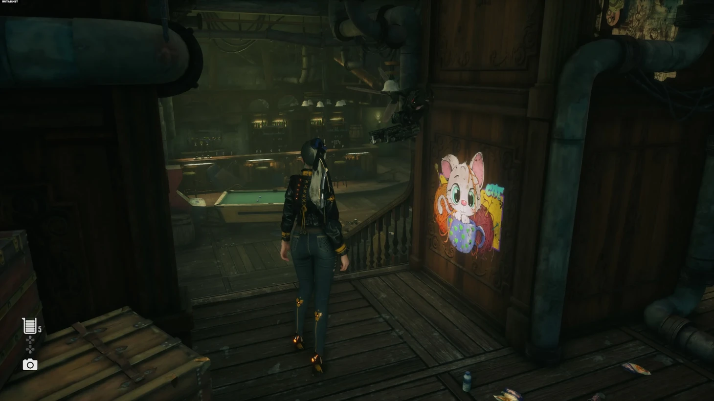 Теперь идем за редкой кошкой – она находится совсем близко от предыдущей точки. Направляйтесь к бару «Последний глоток», затем пройдите по коридору, но не заходите в сам бар.