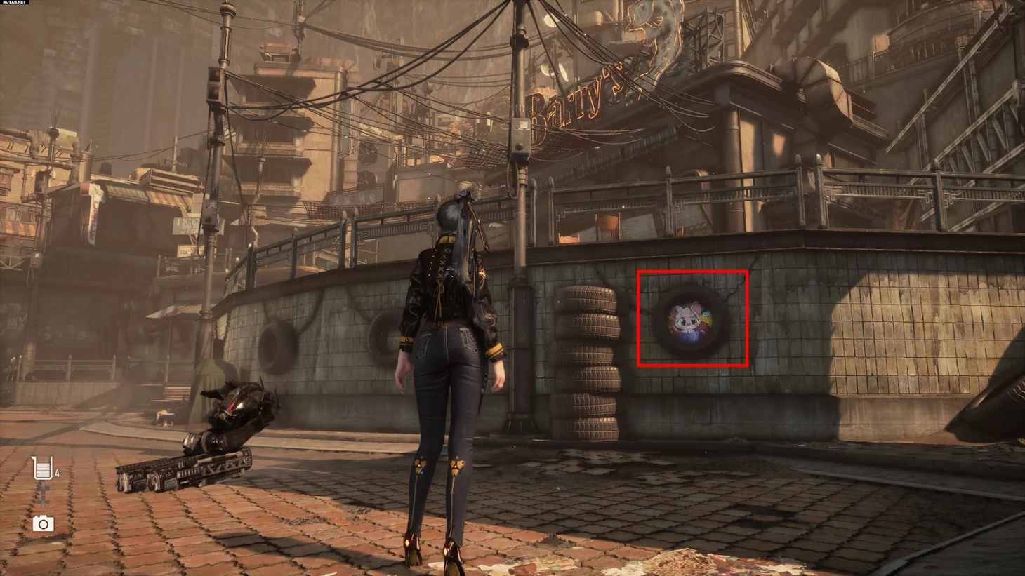 Она сидит почти на виду, прямо под заведением Барри в Сионе. Когда подойдете к Барри, увидите несколько шин, висящих на стене под ним. Именно внутри одной из этих шин и прячется кошка, которую нужно сфотографировать.
