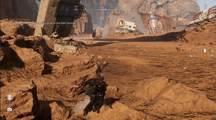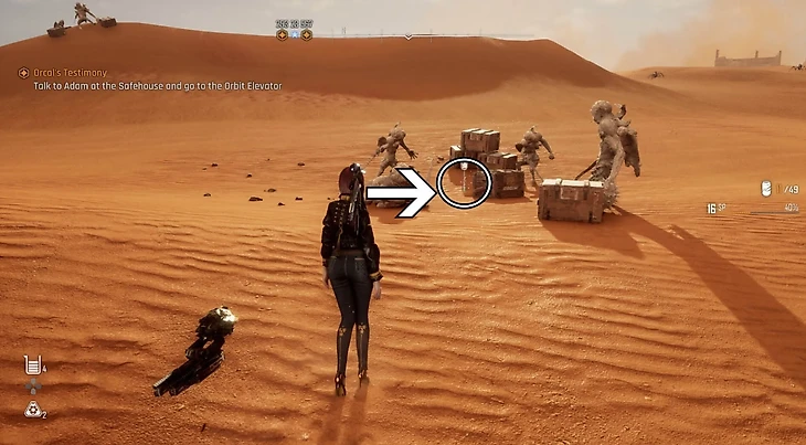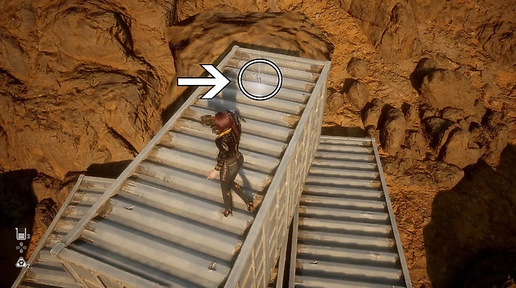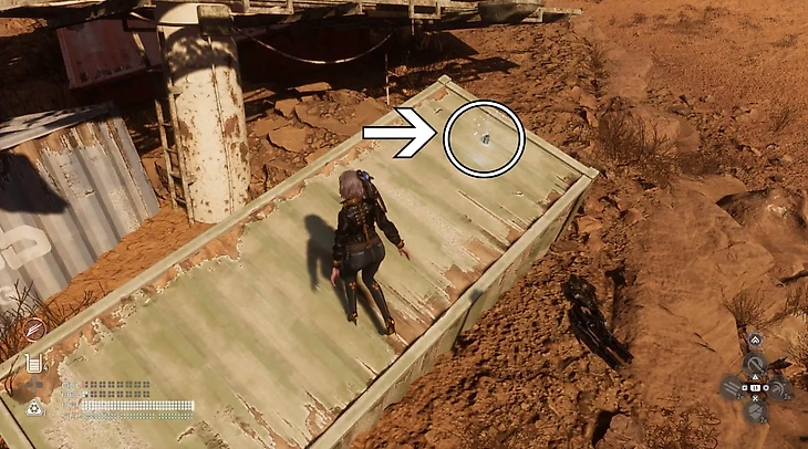 Войдите внутрь этих руин и направляйтесь к пандусу с левой стороны. Поднимитесь по нему, затем встаньте на желтый ящик и перепрыгните на расположенный напротив уступ. Оттуда прыгните на другой выступ в дальнем углу. Повернитесь так, чтобы снова смотреть в сторону убежища – здесь вы заметите скалолазную платформу. Перепрыгните к ней и пройдите по ней, чтобы зацепиться.