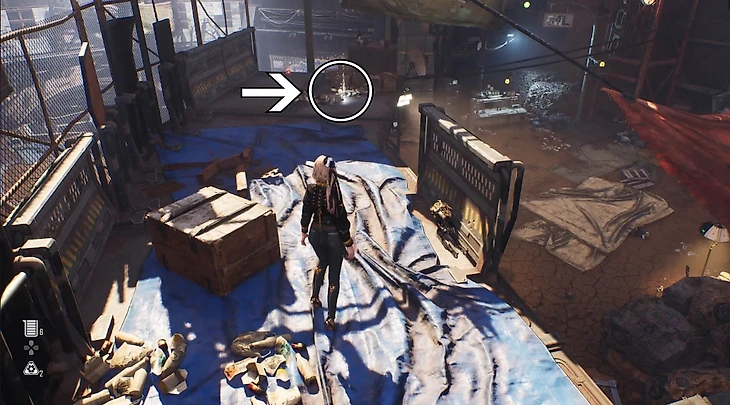 Поднимитесь на автобус, далее по тропинке наверх и продолжайте путь по крышам. Вскоре вы дойдете до площадки, заставленной ящиками и контейнерами. Звездная слеза находится на верхушке самого высокого контейнера в углу, который расположен напротив входа.