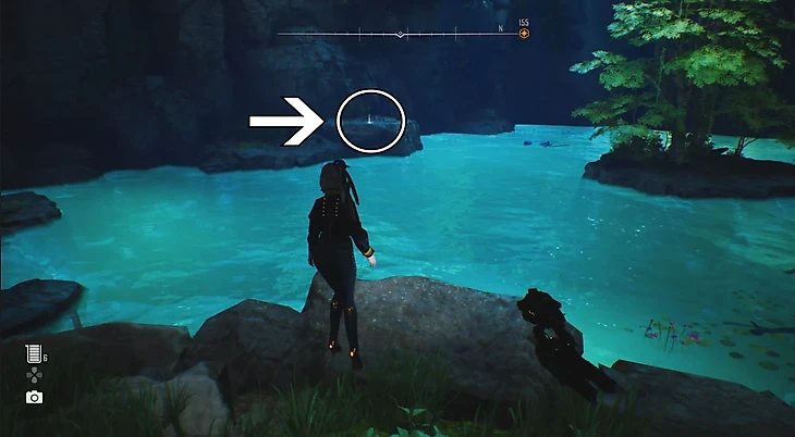 Наверху следуем по извилистой тропинке, пока не заметим торчащие из скалы ветки. Перемещаемся по двум из них – по необходимости прыгаем. Скачем с одной ветки на другую, затем с помощью раскачивания перепрыгиваем на левую – ту, что рядом с небольшим уступом.С нее перекидываемся на скальный выступ напротив. Смотри налево: на стене есть узкий край – туда и нужно прыгнуть. Далее – снова ветка и прыжок за ней на следующий уступ.