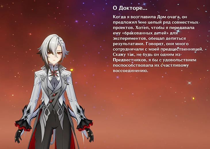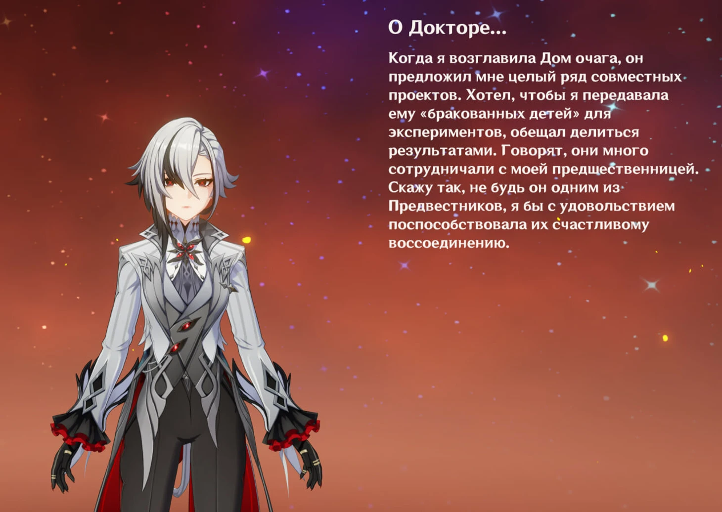 Доктор, вероятно, не станет играбельным до конца Снежной, либо не станет играбельным вообще. MiHoYo придумывает «оправдания» Предвестникам, которых делает играбельными, чтобы не вызывать скандалов в комьюнити. И в случае с Доктором будет сложно оправдать издевательства над Коллеи и убийства других детей.