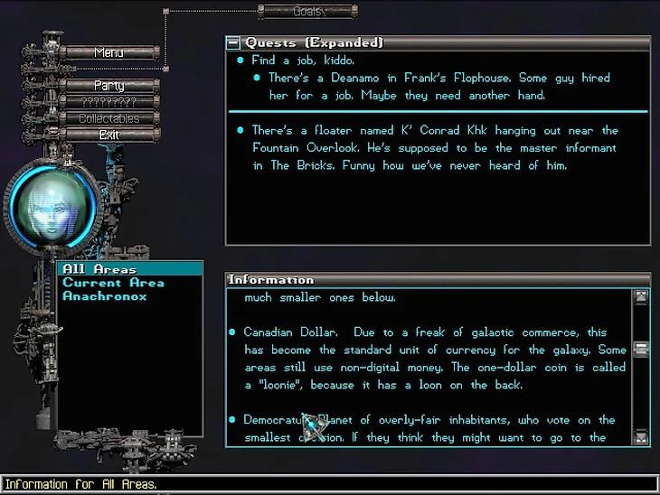 Космос, масса разных планет, межзвездное сообщение, путешествие на кораблях, инопланетяне – обычно в таком сеттинге валюту называют безликими «кредитами», но в Anachronox пошли дальше. Согласно лору игры, из-за странной межгалактической коммерции основной валютой галактики стали канадские доллары, они же луни. В реальной жизни канадцы так называют монету в один доллар, потому что на ней изображена «loon» – гагара.