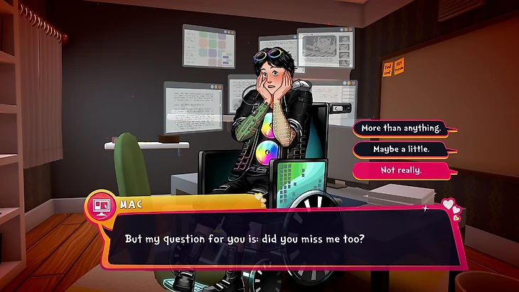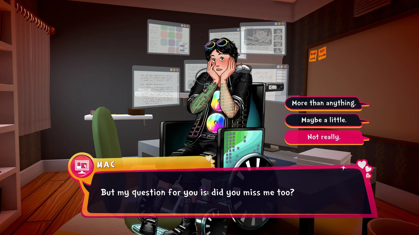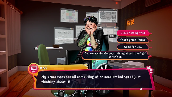 В Date Everything вы можете завести отношения даже с собственным персональным компьютером. Мак (Mac) – ваш офисный ПК с язвительным чувством юмора и устаревшей операционкой. Чтобы сблизиться с ним, придется попрощаться с терабайтами написанных фанфиков. А как еще добиться его расположения?