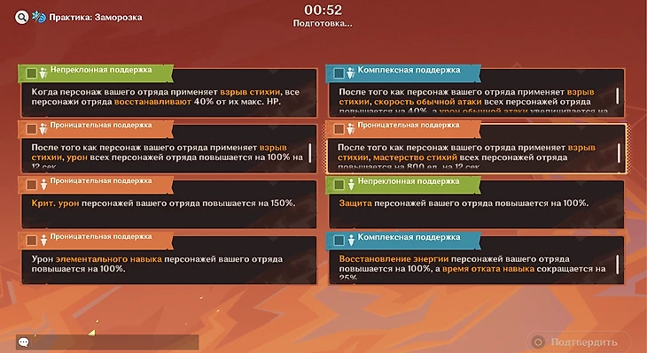 ● Подбирайте состав под тему реакции. Даже если не успели заранее посмотреть, тема покажется перед началом уровня. Если тема – Пар, используйте Пиро и Гидро персонажей, Горение – Пиро и Дендро. Если не используете бафф, теряете в уроне.