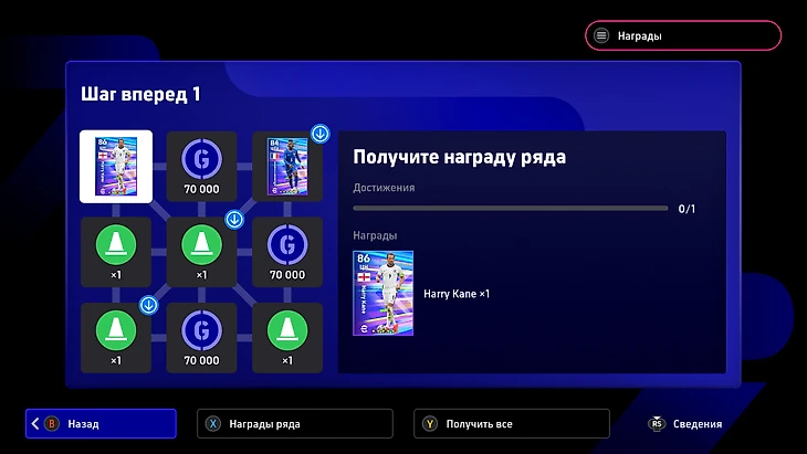 В заданиях появились «Цели ряда». Они группируют челленджи в квадраты из девяти испытаний и дают бонусы по принципу из игры крестики-нолики. В стартовом событии «Шаг вперед» можно найти футболистов и золото.
