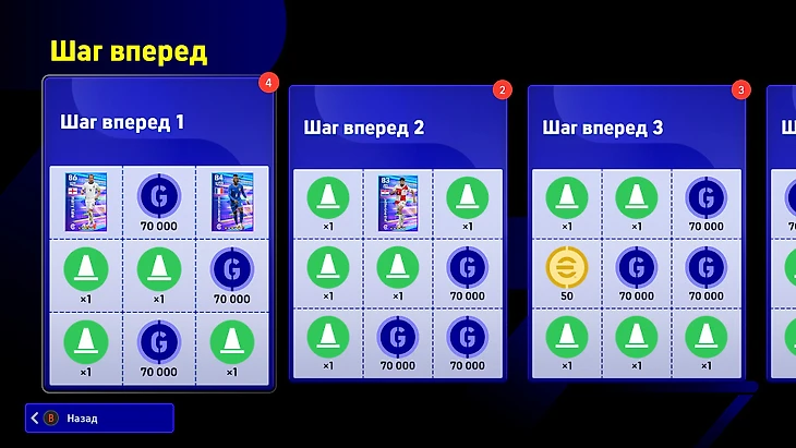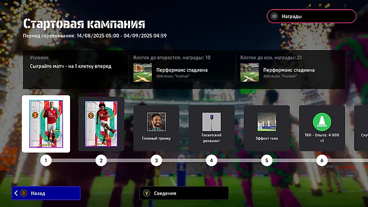 Разработчики заметно улучшили боевой пропуск. Раньше он шел пару месяцев и предлагал однообразные бустеры и золотые монеты. На релизе eFootball 2026 появилась интересная стартовая кампания с наградными карточками игроков, тренеров, случайными сделками и кастомизацией стадиона.