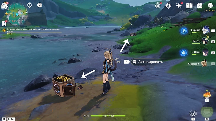 Вернитесь к южному телепорту и направляйтесь на северо-запад. Вы увидите группу солдат Фатуи.