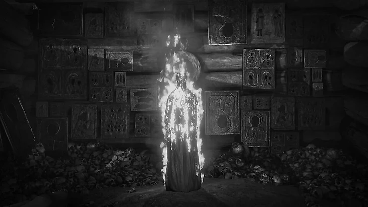 Мир вокруг нас дышит мрачным очарованием ушедшей эпохи. Каждая локация, от заброшенной избы до древнего храма, пропитана духом старины и проработана до мельчайших деталей. Возникает непреодолимое желание изучать всё: вглядываться в надписи на стенах, пытаться разгадать смысл рисунков, стараться обшарить каждый уголок в поисках чего-то интересненького (или кого-то, хе-хе). Приятно было обнаружить в игре отсылочку на один из моих любимых фильмов. На своем пути мы будем находить милых Мортёшек, которые нужно сжигать (об этом я догадалась не сразу). Особый шарм придают находки - предметы старины, некоторые из них можно будет обсудить с Портным в «уютненькой» Трапезной. Эти беседы проливают свет на прошлое и придают нашему путешествию глубину.