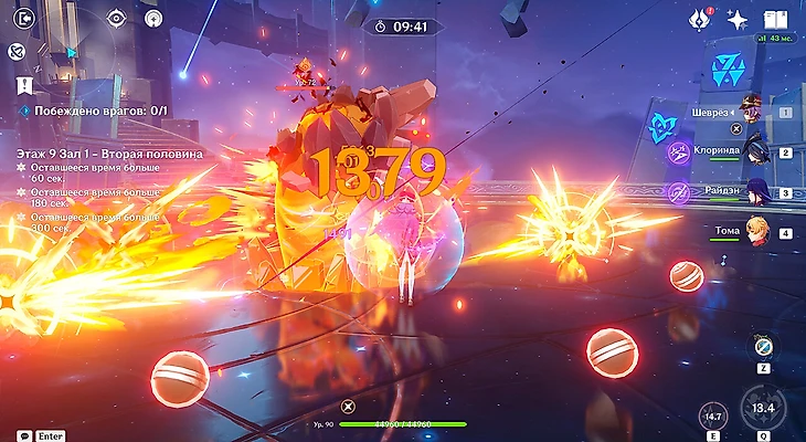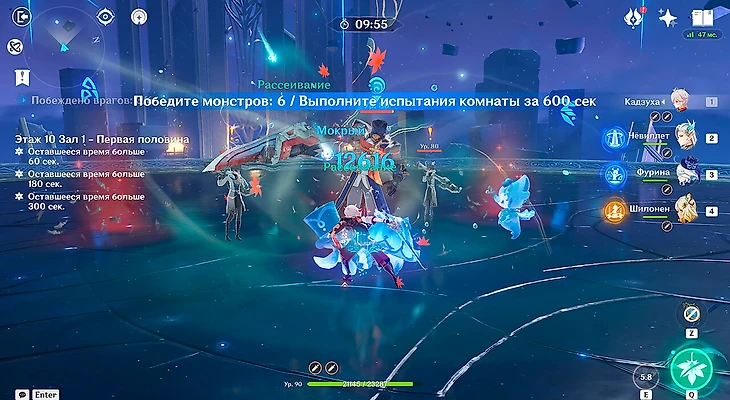 В первой половине девятого зала ожидают новые крейсеры Фатуи различных стихий и размеров. Возьмите в отряд стяжку, чтобы было проще наносить урон всем соперникам сразу. Возьмите любую удобную команду.