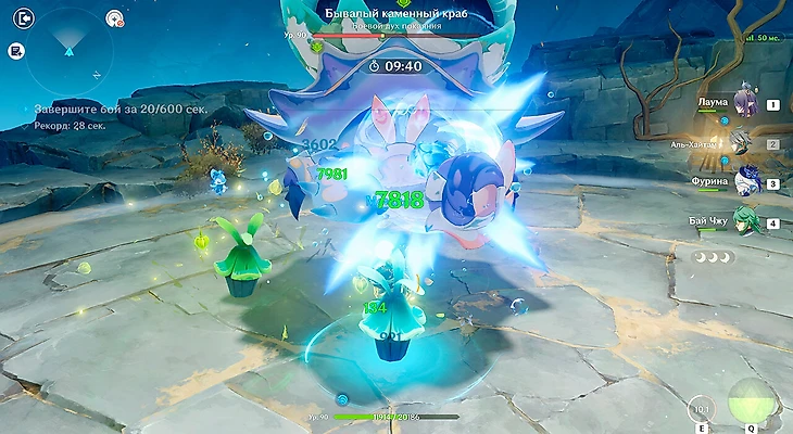 Новый босс Каменный краб похож на Горного короля юмказавров – он тоже раскидывает что-то по полю, и если это не уничтожить, он повысит свой урон. Только вместо плодов Краб разбрасывает каменные бомбочки, которые нанесут урон, если взорвутся. Их можно обезвредить реакциями Бутонизация, Цветение (см. под командами), Вегетация или Лунная бутонизация – то есть реакциями, связанными с бутонами. Если атаковать бомбы этими реакциями, то они нанесут урон Крабу.