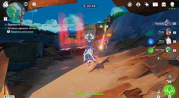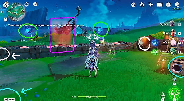 В первом испытании нужно набраться энергии куухенки от красных ботов (бирюзовый цвет), взять камни (белый цвет) и отправлять их в дроны (зеленый цвет). Иногда на стенде будут появляться препятствия в виде стенок (фиолетовый цвет), через которые камни не пролетают. Можно отбежать в другой конец площадки или дождаться, пока стена пропадет, чтобы кинуть камень.