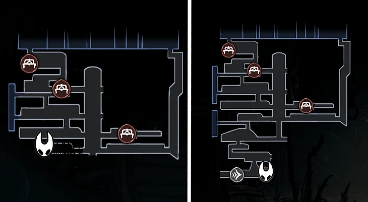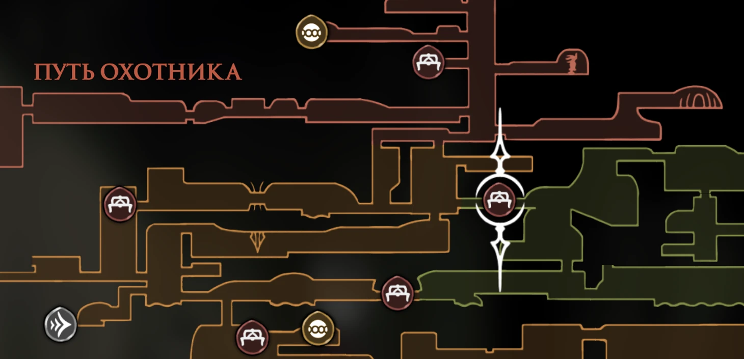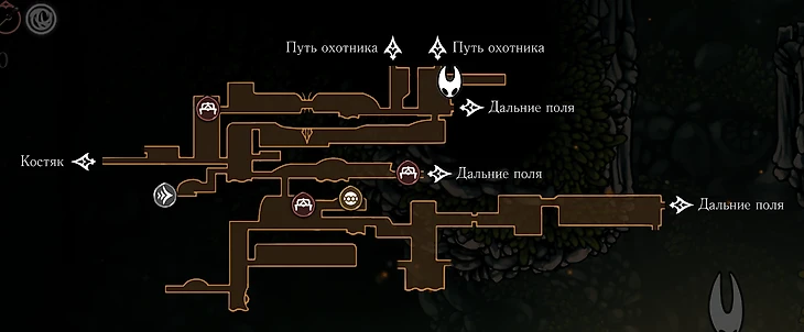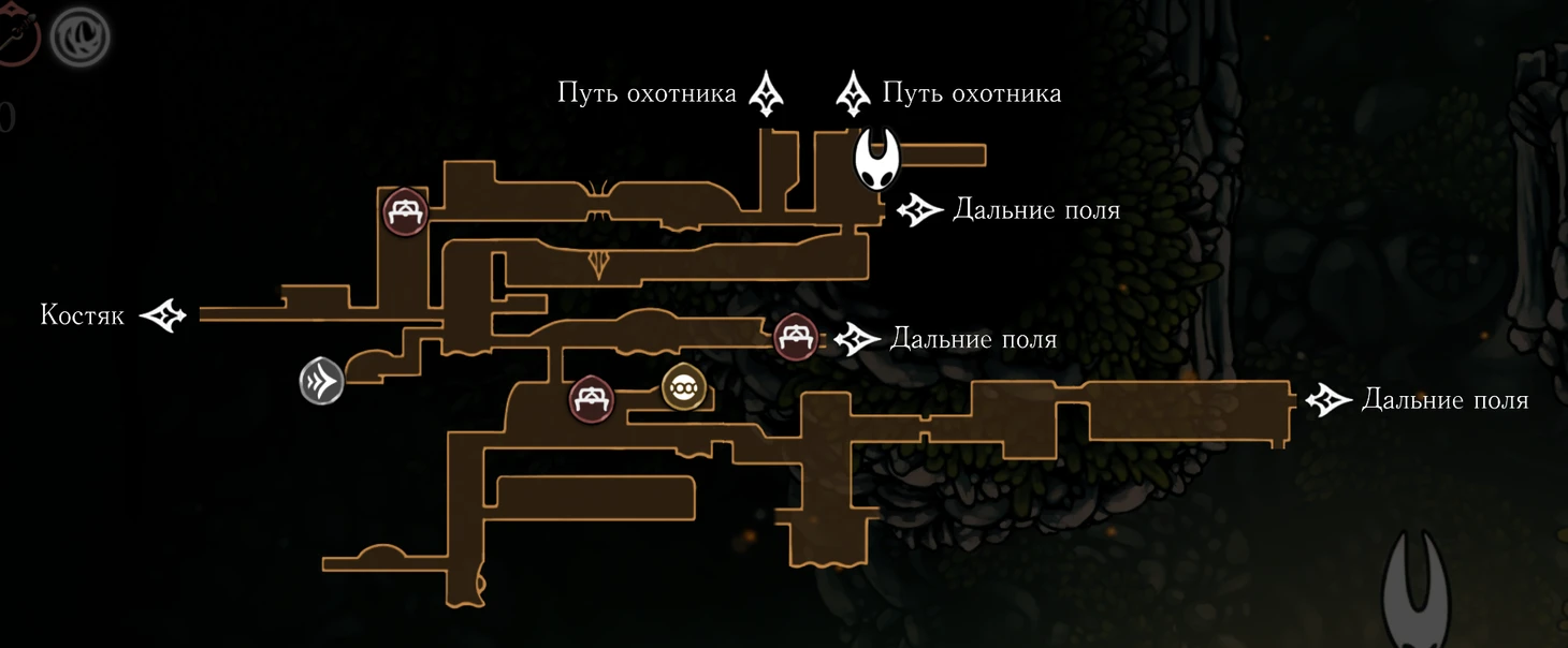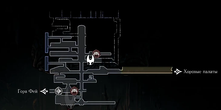 Фрагмент маски и Кусочек катушки. Первый увеличивает здоровье Хорнет и находится в комнате с испытанием на ловкость (нужен ключ Отступника). Второй улучшает способности, лежит в западной части локации на верхних уровнях.