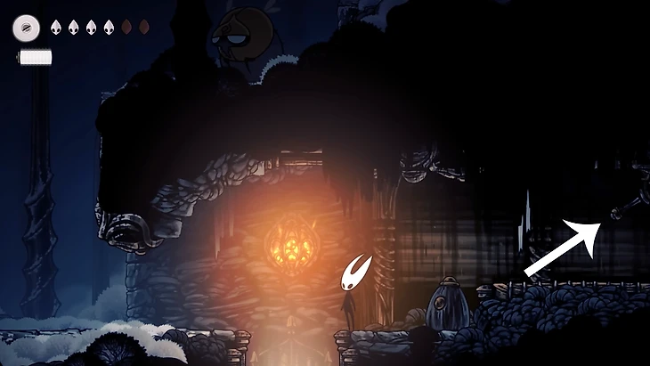 После этого придется пройти платформинговую секцию. Когда все получится и Хорнет окажется на Горе фей, бегите налево до первого источника тепла. На локации бьет мороз, бежать нужно быстро.