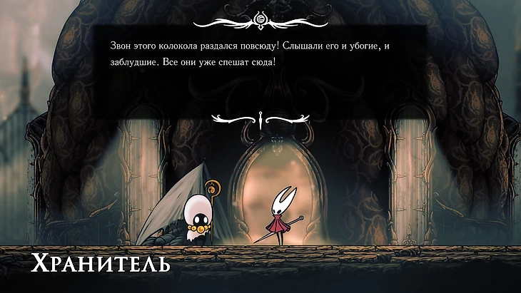 Внутри находится огромный колокол, окутанный паутиной. Избавьтесь от нее (подойдут даже обычные удары). Как только он зазвонит, появится НПС по имени Хранитель.