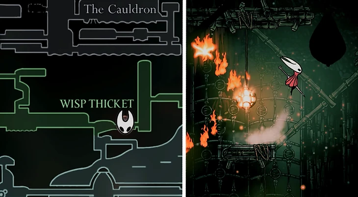 Металл спрятан в подземной системе туннелей. Отскакивайте от колокольчиков и используйте Плащ Бродяги, чтобы спуститься вниз. Затем двигайтесь преимущественно налево.