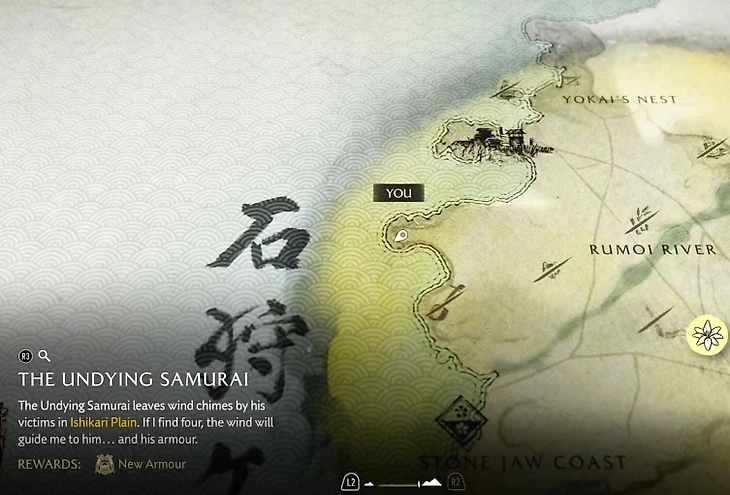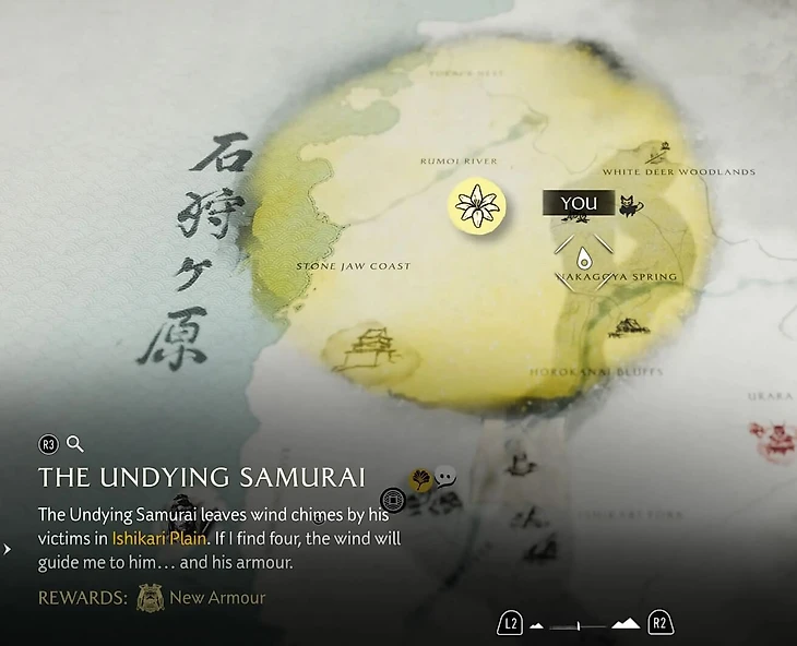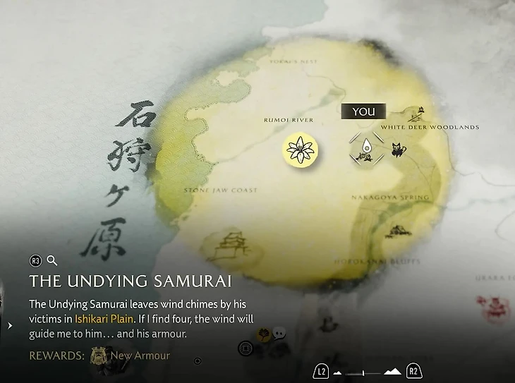 Чтобы запустить квест с Бессмертным Самураем, достигните северо-западной части равнины Исикари. Там вы найдете сожженную деревню – отправную точку задания. Подойдите к мужчине, сидящему у камня внутри деревни, и поговорите с ним. Он расскажет слух о Страннике-рассказчике (Ugetsu the Storyteller) и Бессмертном Самурае, активируя мифическую сказку «The Undying Samurai».
