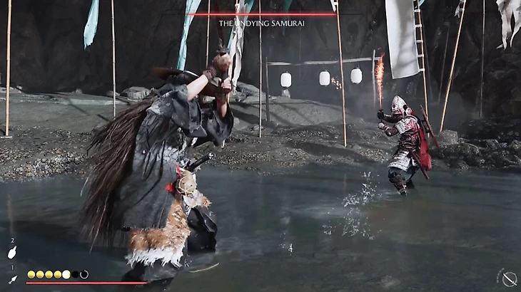 Следуйте вниз по скале в водяную пещеру. Внутри подойдите к четырем деревянным столбам и разместите колокольчики – запустится кат-сцена, вызывающая Бессмертного Самурая.