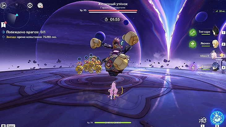 Первый босс появляется без специальных щитов и механик. У него нет повышенного сопротивления к стихиям, но много окон неуязвимости, в течение которых он вообще не получает урон. Чтобы компенсировать время, которое вы теряете на его анимациях, подбирайте команды с высоким уроном в одну цель.