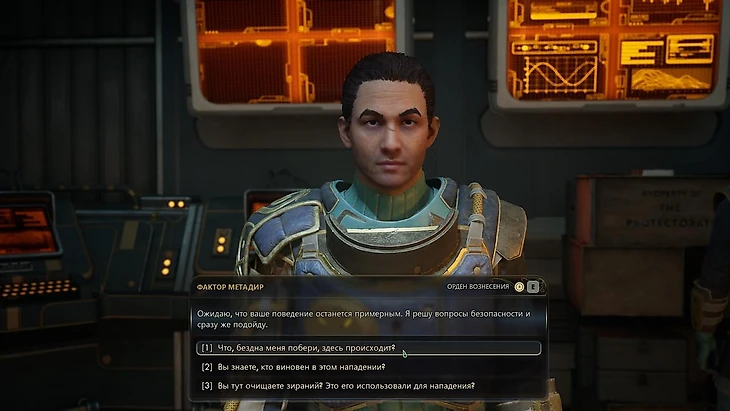 Перед уходом можно расспросить Метадира о том, что произошло. Он поделится тем, что управление объектом перехватила адепт Альва, и именно ее считают главным подозреваемым в запуске бомбы.