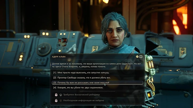 Спустившись вниз на лифте, вы столкнетесь с проктором Свободой. Она убеждена, что Альва причастна к инциденту, и просит вас задержать ее при необходимости. Не спешите соглашаться – просто уточните у нее подробности и не принимайте сторону заранее.