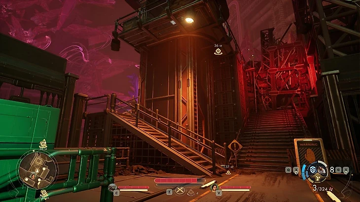 Чтобы попасть в центральный обрабатывающий пункт, выйдите из помещения Альвы и направляйтесь через дверь, расположенную справа. Оказавшись на улице, поднимитесь по лестнице слева, затем перейдите по мосту и воспользуйтесь лифтом, который доставит вас на верхний этаж.