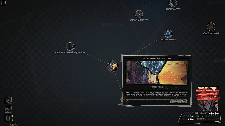 Намерения появляются в Карте Разума как идеи. После их активации в игре  появляются специальные реплики в диалогах с персонажами. Для этого нужно накопить достаточно воспоминаний, а затем потратить очки Воли или Вдохновения.