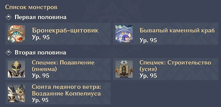В первой волне появляется Бронекраб щитовик с Пиро щитом. Он держит 70% сопротивления ко всем элементам, поэтому снимайте щит Гидро. Во второй волне выходит Бывалый каменный краб с примерно 3,6 млн HP. Это основной враг зала, и здесь требуется Бутонизация.