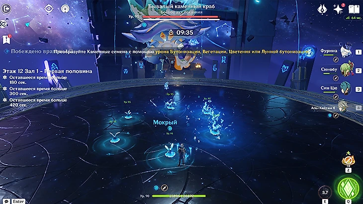 Лунная Бутонизация работает особенно удобно. Навык Лаумы, если дать его в центр арены, активирует сразу шесть семян, что сбивает краба за секунды. Если не успеть активировать семена вовремя, босс применит атаку, которая почти гарантированно ваншотает активного персонажа. После падения краб остается оглушенным примерно 4 секунды, затем сопротивления возвращаются в норму.