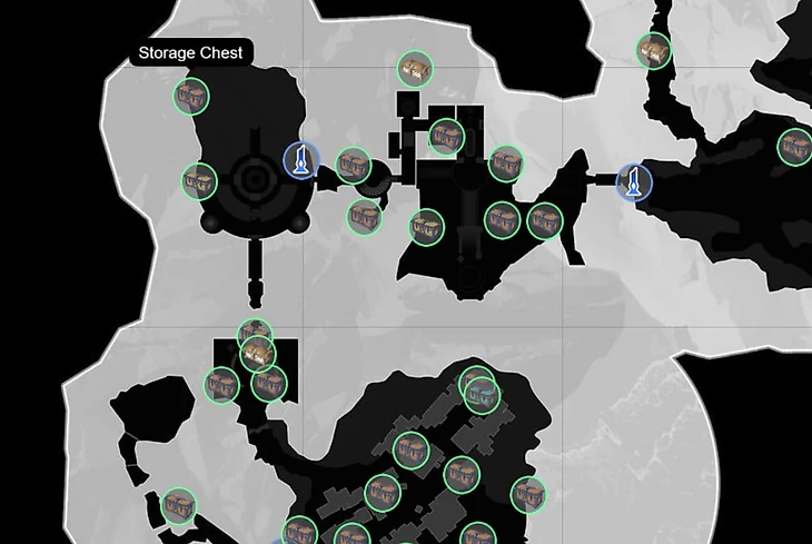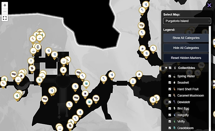 Вверху справа можно переключать регионы: Purgatorio Island, Icelake, Icelake Sewer, Glevum Pit, Galea Theater и Lonza Fortress. Выберите интересующий вас регион и отметьте только нужные маркеры: