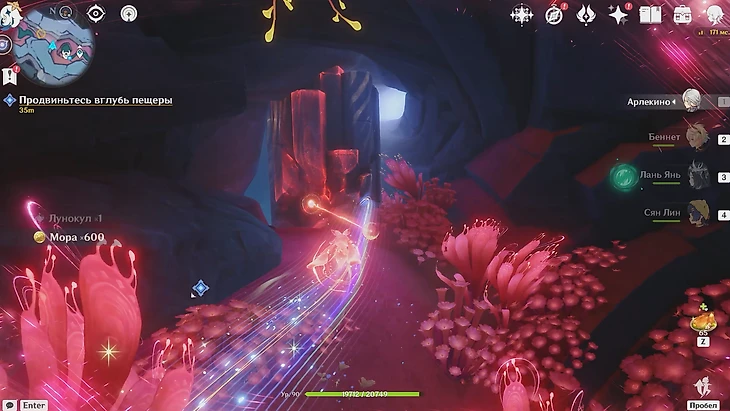 Далее вы дойдете до зоны с зеркалами и Лунными путями. Встаньте на платформу с зеркалом, дождитесь исчезновения барьера под ногами и используйте планер, чтобы безопасно спуститься. Лунные пути помогают быстро перемещаться по пещере, но во время полета нужно вовремя нажимать T, чтобы разрушать препятствия и избегать столкновений со столбами.
