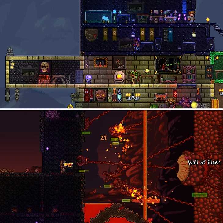 Игра сразу цепляет сочетанием строительной механики и боевки. Представьте двухмерный Roblox, но с более глубокими элементами RPG и яркими сражениями с боссами. Игрок начинает со слабых инструментов, постепенно прокачивается и переходит к созданию магического снаряжения и возведению безумных построек.