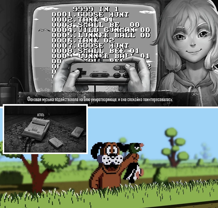 Олечка, сестра Антона, тоже видит загадочных чудовищ и переживает из-за ссор родителей. Чтобы ее успокоить, брат предложит поиграть в приставку. Игра вдохновлена Duck Hunt (1984), геймлей тот же – управляйте прицелом и попадайте в гусей, соревнуясь с Олей в меткости.