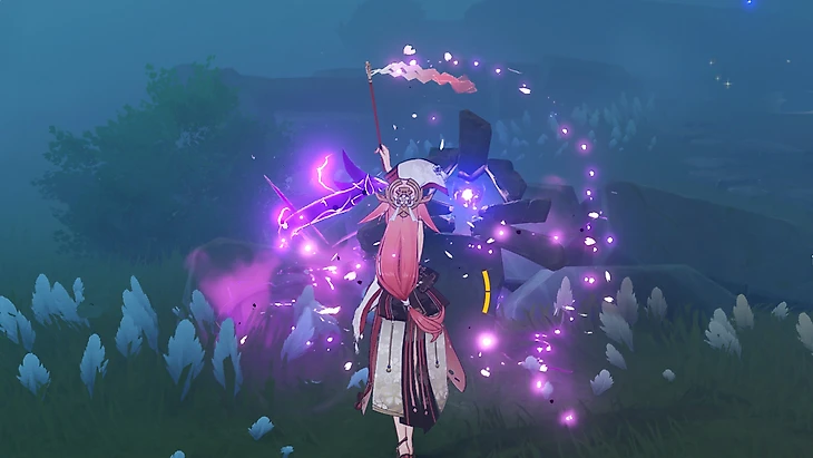 Эта часть – кульминация всего задания. Здесь туман искажает пространство, сбивая героя с пути. В первую очередь нужно использовать Электро умения, чтобы активировать громовые камни, создавая безопасные зоны движения.