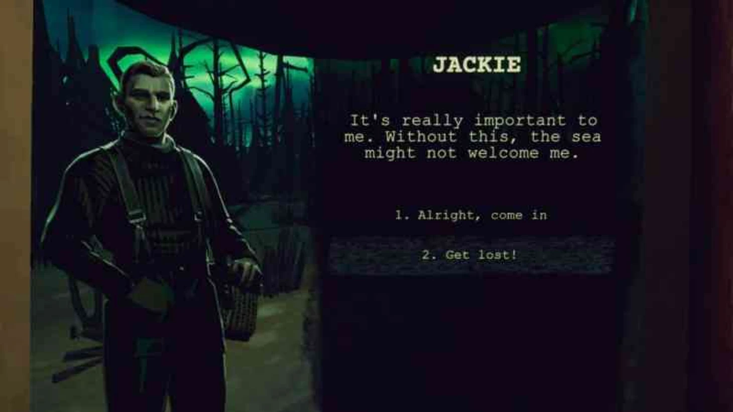 Если не пустить его – он будет смотреть в море перед тем, как отплыть – недвусмысленный намек на гибель, хотя там все намного страшнее. Лучше пустить Джеки, чтобы узнать побольше о Статическом ужасе. В дальнейших квестах это очень и очень пригодится.