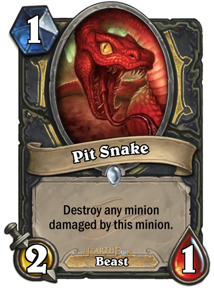 Ранкед: у разбойника уже есть классовая карта с подобной способностью — «Терпеливый убийца» и она никому не нужна, хотя имеет очень интересную особенность в виде дополнительной невидимости. Змея мне видится интересной не как самостоятельная карта, а как один из вариантов дропа с нового друидского раптора и теперь можно сказать, что «Голодный дракон» станет еще более плохой картой — ведь он может умереть от одной змеи, которую вы призовёте противнику.
