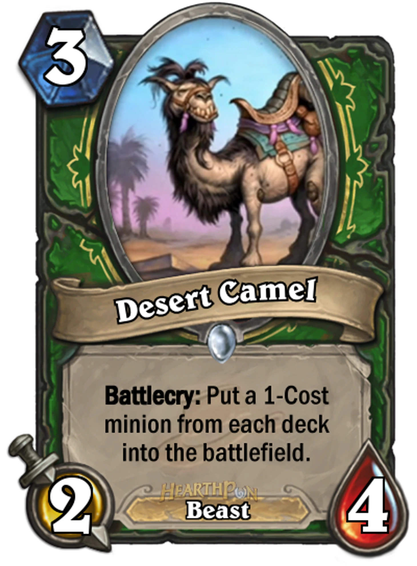 Арена: неплохой зверь, и он будет просто отлично играть, если ваш противник не имеет существ за 1 ману у себя в колоде, в иных случаях могут быть конфузы, но почти все одномановые миньоны не представляют большой угрозы и будут убраны со стола тем же верблюдом. Если вы не надрафтили 1-мановых существ, то не берите эту карту, ибо в таком случае она будет играть сильно в минус.